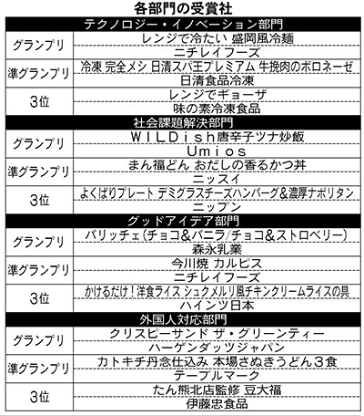 ニチレイフーズのライン&マーケティング戦略部商品第一部の蟹沢壮平氏によると、「氷を入れて電子レンジで冷たく仕上がる『冷し中華』の技術と、トレーに水を注いで電子レンジ調理する『本当にうまい担々麺』や『香ばし炒めの濃厚味噌ラーメン』の技術を融合した」という。 「レンジで冷たい 盛岡風冷麺」は今春の新商品だが、ゴールデンウィーク明けの気温が上昇したころ、店頭に数多く並ぶ見通し。 グッドアイデア部門で「今川焼 カルピス」が準グランプリを受賞している。 Umios、包材が皿代わりに