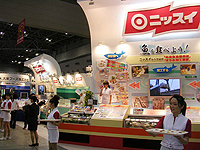 ●シーフードショー 賑やかに開催 井出万寿男 (週刊水産タイムス:09/07/27号)大手水産もブースで競演 夏の恒例イベントになったアジア最大級の水産商材国際見本市「ジャパン・インターナショナル・シーフードショー」(主催:大日本水産会、中須勇雄会長)が東京ビッグサイトで22〜24日、にぎやかに行われた。各ブースには鮮魚から完成度の高い水産加工品まで、国内外から様々なシーフードが一堂に会し、多くの量販店や外食産業のバイヤーらが熱い商談を繰り広げた。